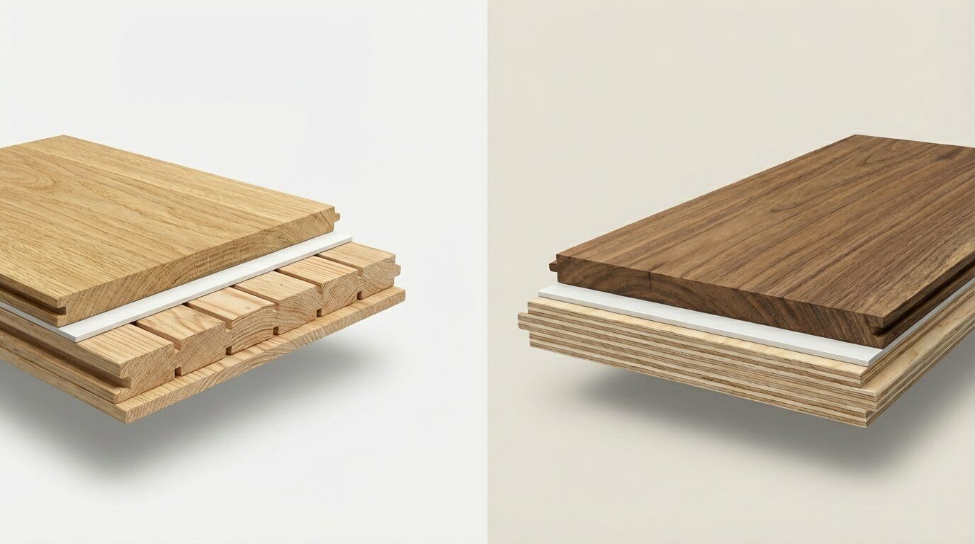 Основная разница между этими покрытиями — в том, как они устроены внутри. Именно конструкция определяет все остальные характеристики: где можно укладывать, как долго прослужит, сколько раз можно отреставрировать.