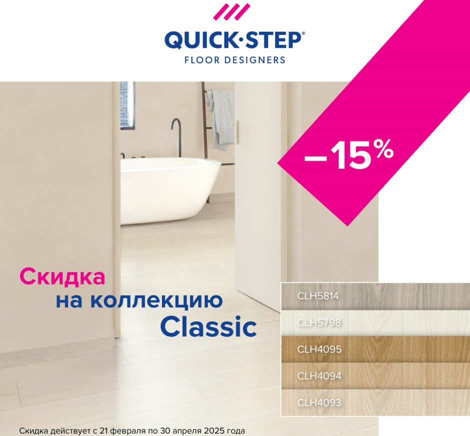 Планируете обновить полы? У нас отличные новости! Только сейчас вы можете приобрести ламинат Quick Step коллекции Impressive и Classic со скидкой 15%. Это отличный шанс купить качественное покрытие по сниженной цене и сделать ваш интерьер стильным и долговечным.